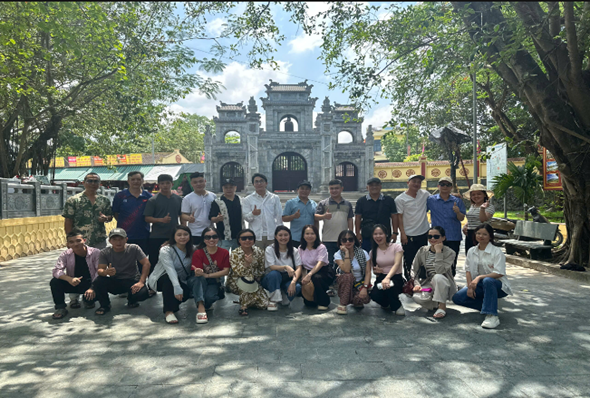 Ngay từ những giờ đầu khởi hành, bầu không khí trên xe đã tràn đầy tiếng cười và sự háo hức. Điểm dừng chân đầu tiên của chuyến hành trình 3 ngày 2 đêm là địa điểm tham quan tâm linh, nơi mang đậm dấu ấn văn hóa truyền thống. Trong không gian thanh tịnh và trang nghiêm, đoàn không chỉ có cơ hội chiêm ngưỡng vẻ đẹp kiến trúc mà còn lưu giữ những khoảnh khắc ý nghĩa qua những bức hình tập thể rạng rỡ